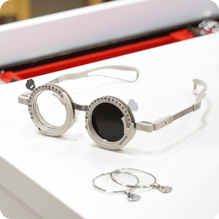 検眼枠けんがんわくとは、視力しりょく検査けんさの時ときにかける特別とくべつなメガネの枠わくです。いろいろな度数どすうのレンズを入いれ替かえながら、どのレンズが一番いちばんよく見みえるかを調しらべることができます。