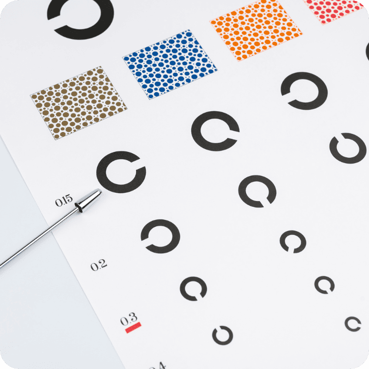 視力しりょくを調しらべる時ときに見みる、アルファベットの「C」のようなマークのことです。検査表けんさひょうから5m(3mや1mのものもあります)はなれた場所ばしょから、マークの上うえ・下した・左ひだり・右みぎなど、どこが切きれているかを見みて、視力しりょくがどれくらいかを調しらべます。