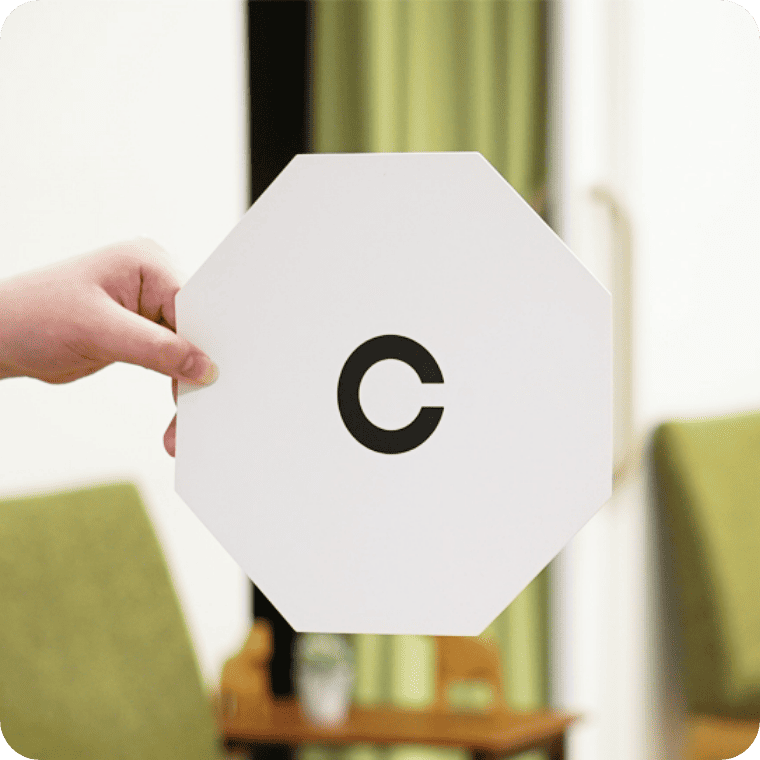 (しりょくけんさひょう)視力しりょく検査表けんさひょうとは、視力しりょく検査けんさの時ときに使つかう、文字もじや記号きごうが書かかれた表ひょうです。上うえから下したにいくにつれて文字もじや記号きごうが小ちいさくなっていて、どこまで見みえるかを調しらべることで、視力しりょくを確認かくにんすることができます。